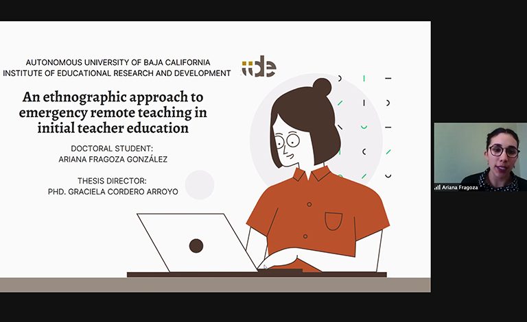 Ariana Fragoza González, estudiante del DCE, presentó un panorama general de su proyecto de tesis ´´Un acercamiento etnográfico a la enseñanza remota de emergencia en formación inicial de docentes´´ bajo la dirección de la Dra. Graciela Cordero Arroyo. Explicó que se encuentra en la etapa exploratoria y que es un estudio centrado en el concepto ´´Enseñanza remota de emergencia (ERT, por sus siglas en inglés)´´ un concepto utilizado por investigadores de educación en línea para establecer un contraste claro entre ERT y la educación en línea de alta calidad.